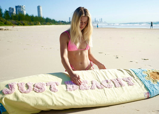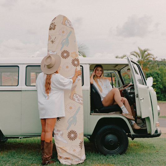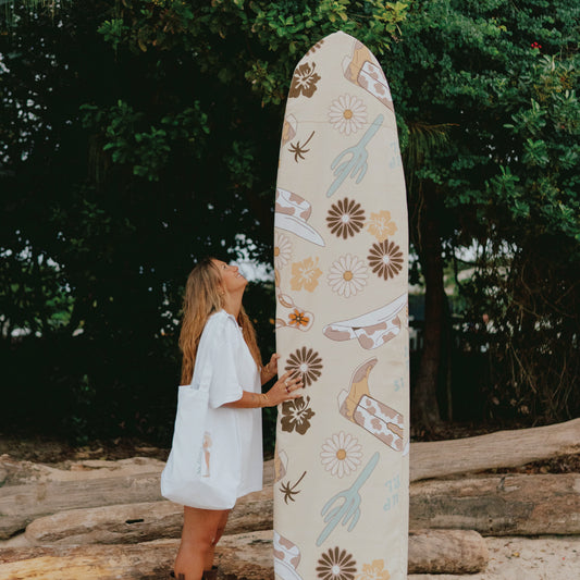 The Limited Edition Samira x Surfboard Soks Collection — where surf culture meets cowgirl cool. Featuring custom artwork designed in collaboration with Samira, this exclusive drop brings a playful, wave-riding western vibe to life. Think cowgirl hats on surfboards, sandy sunsets, and a whole lot of coastal sass. The collection includes a Surfboard Sok, Tee, Tote Bag, Sticker, Cap, and Socks — all designed to make a statement.
