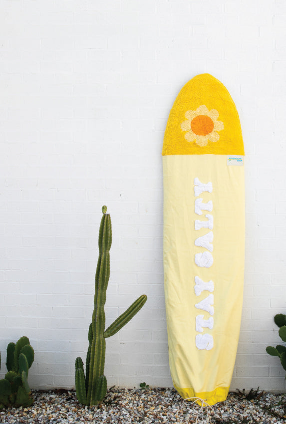 Introducing the Tawny Daisy Mid-Length Surfboard Sok. Made from GOTS Certified Recycled Cotton and designed to protect your surfboard from scratches, dings, and UV damage, this 8'2 Sok is perfect for trips to the beach or coastal road trips. It also keeps your car sand-free and prevents fin scratches and wax marks. Available now!