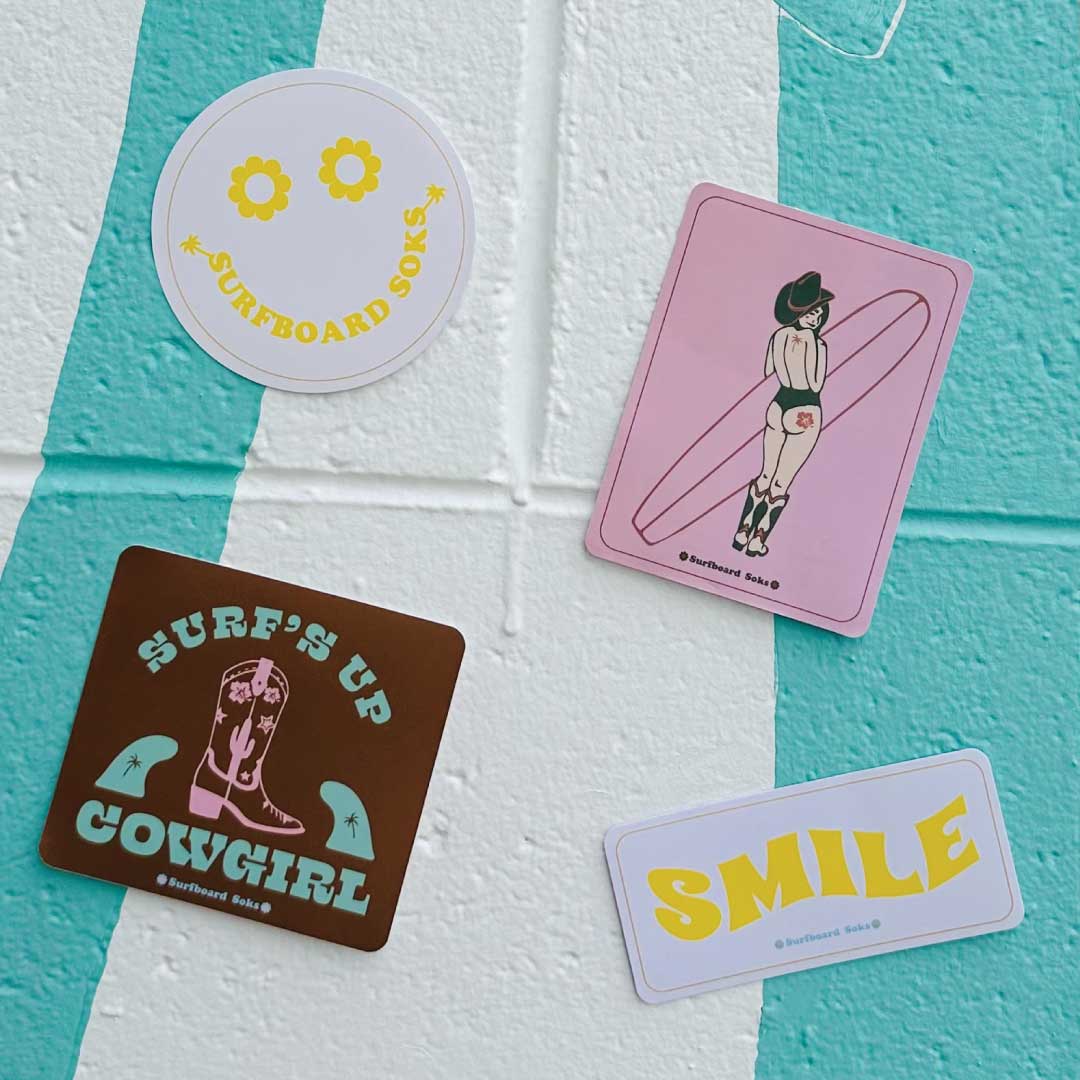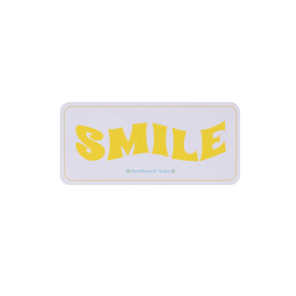This beautiful eye-catching 'Smile' graphic sticker is custom-designed by the team at Surfboard Soks and printed on high-quality vinyl. It is waterproof, has easy-peel die-cut edges, and is printed on a clear background. It measures 7cm high x 12cm wide and can be stuck on any smooth surface such as your car bumpers, windows, laptop, notebook, school books, skateboard, water bottles, fridges, windows or even surfboard!