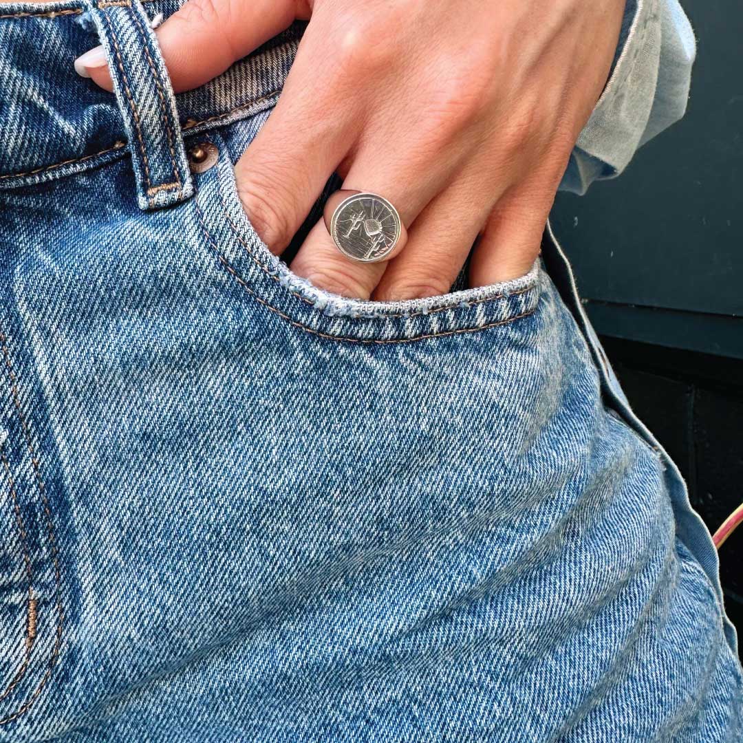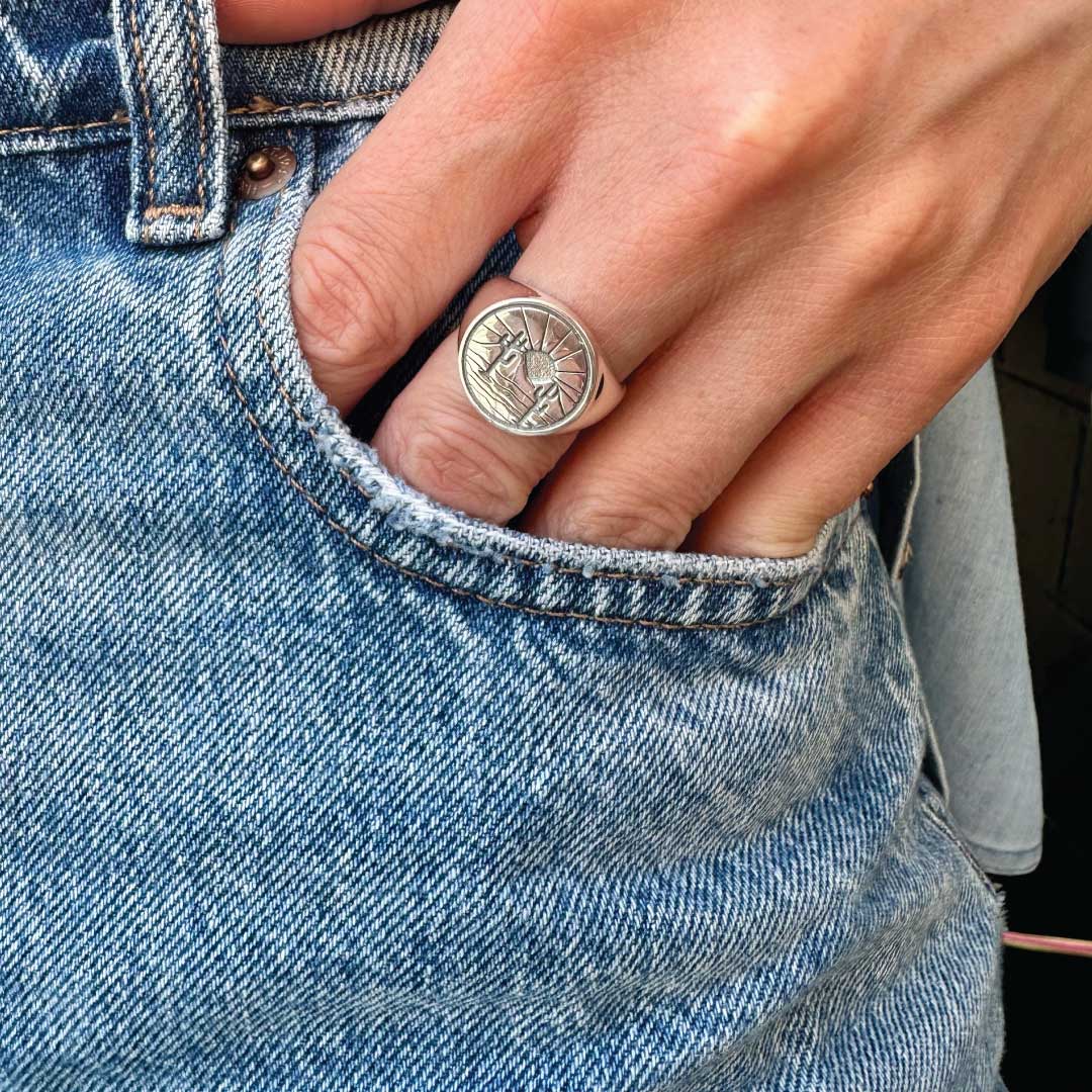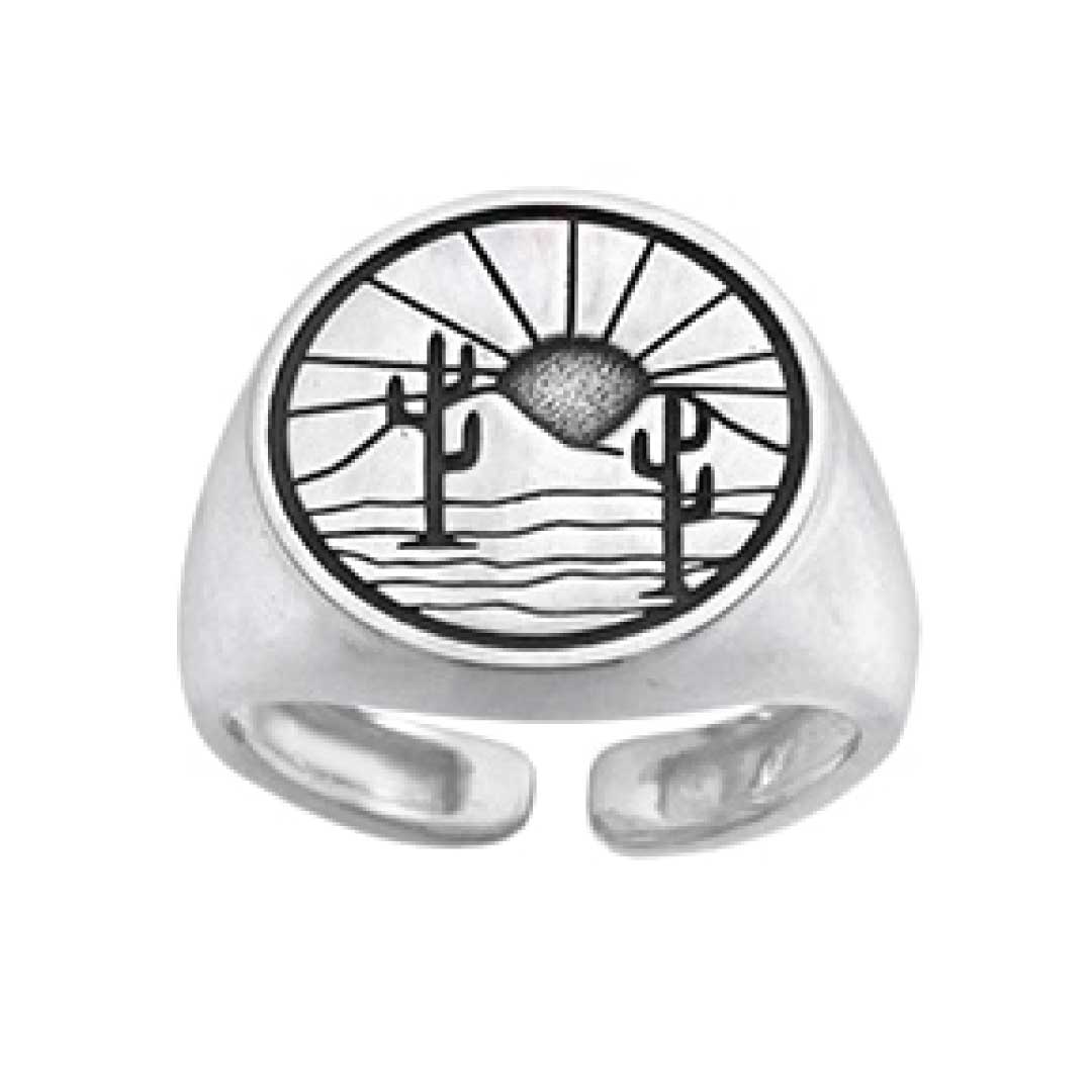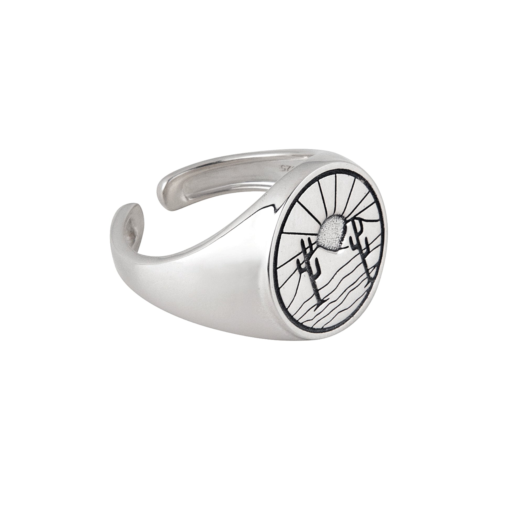 Surf's up, cowgirl! This adjustable Number 8 ring is crafted from 925 silver and features a 16mm round signet-style face engraved with a dreamy desert scene—cactus, rolling hills, and a sunset icon. The oxidized finish adds a rugged, vintage vibe, while the adjustable design makes it easy to size up or down for the perfect fit. Channel your desert dreams and wild spirit with this unique piece, perfect for any adventure!