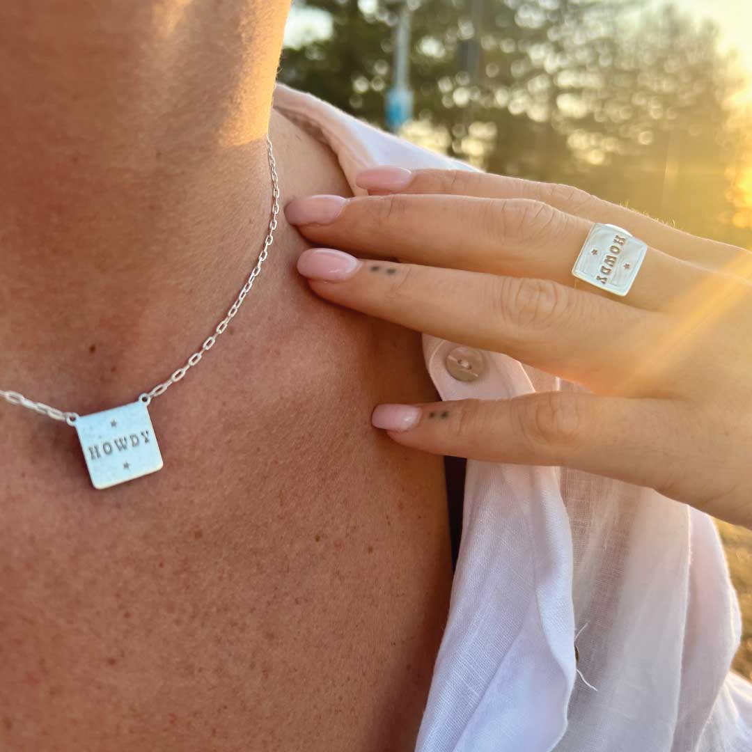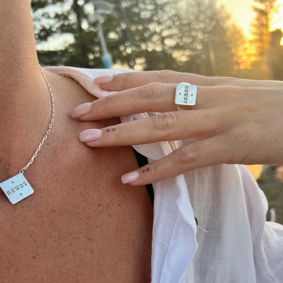 Surf's up, cowgirl! This adjustable Number 8 ring is made from premium 925 silver and features a 14mm square signet-style face engraved with a playful 'Howdy' icon. With an oxidized finish for that rugged, vintage vibe, this ring is perfect for sizing up or down to fit any finger. Whether you're hitting the waves or exploring the Wild West, this versatile piece brings a bold, adventurous spirit to any look. Ride the wave and stay wild!