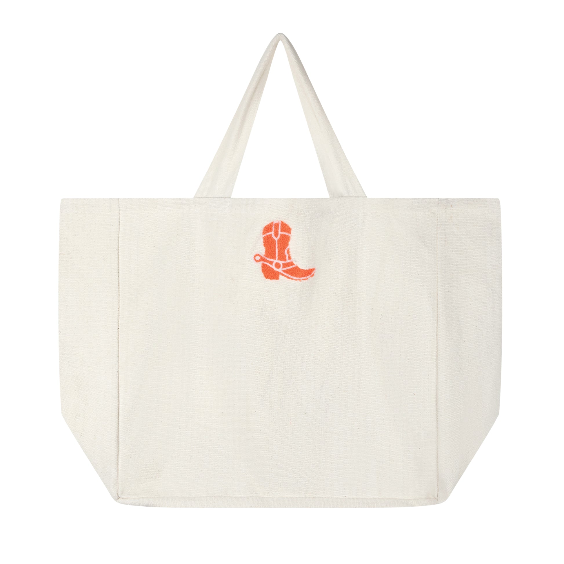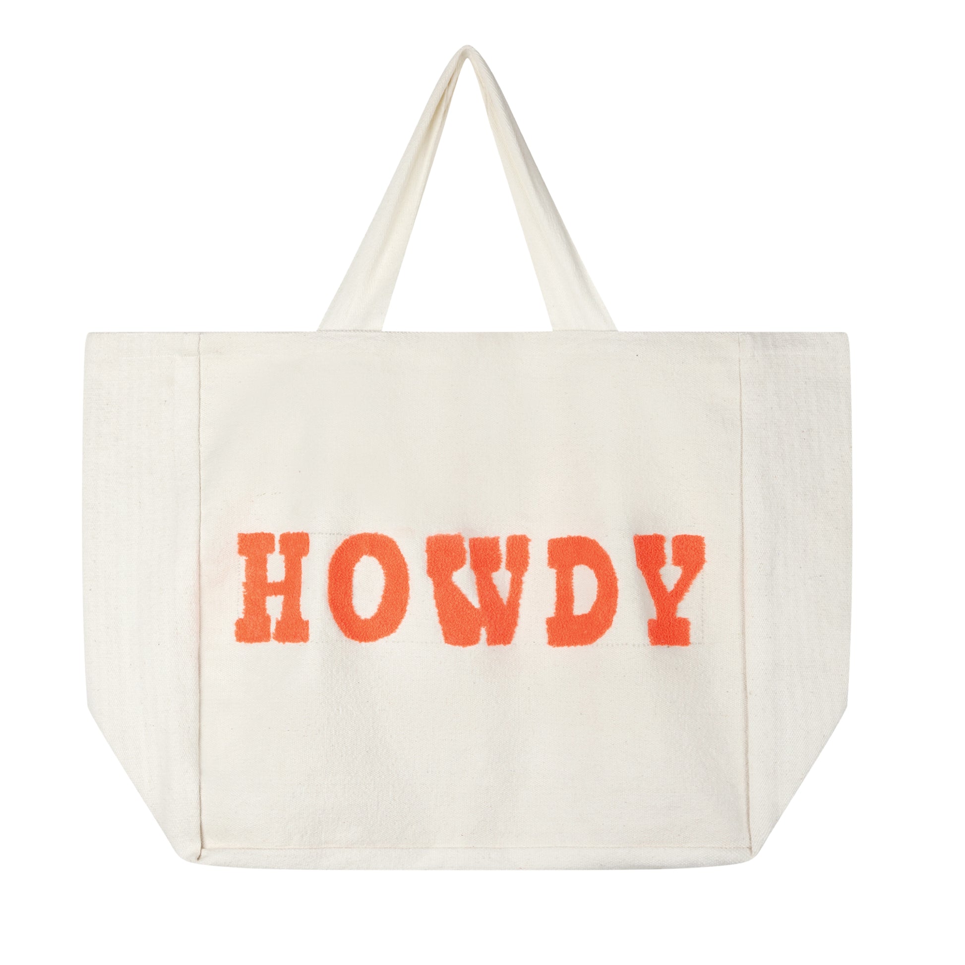 "Say HOWDY in style with this large cotton tote bag! Measuring 49cmW x 45cmH x 23cmD, this spacious and durable tote features bold tufted embroidery spelling 'HOWDY,' bringing a fun, western-inspired vibe to your everyday essentials. Perfect for beach days, market trips, or carrying all your daily must-haves with ease and flair. 🤠✨"
