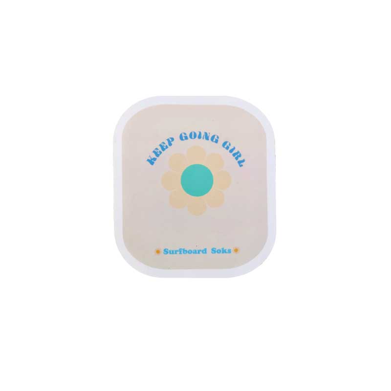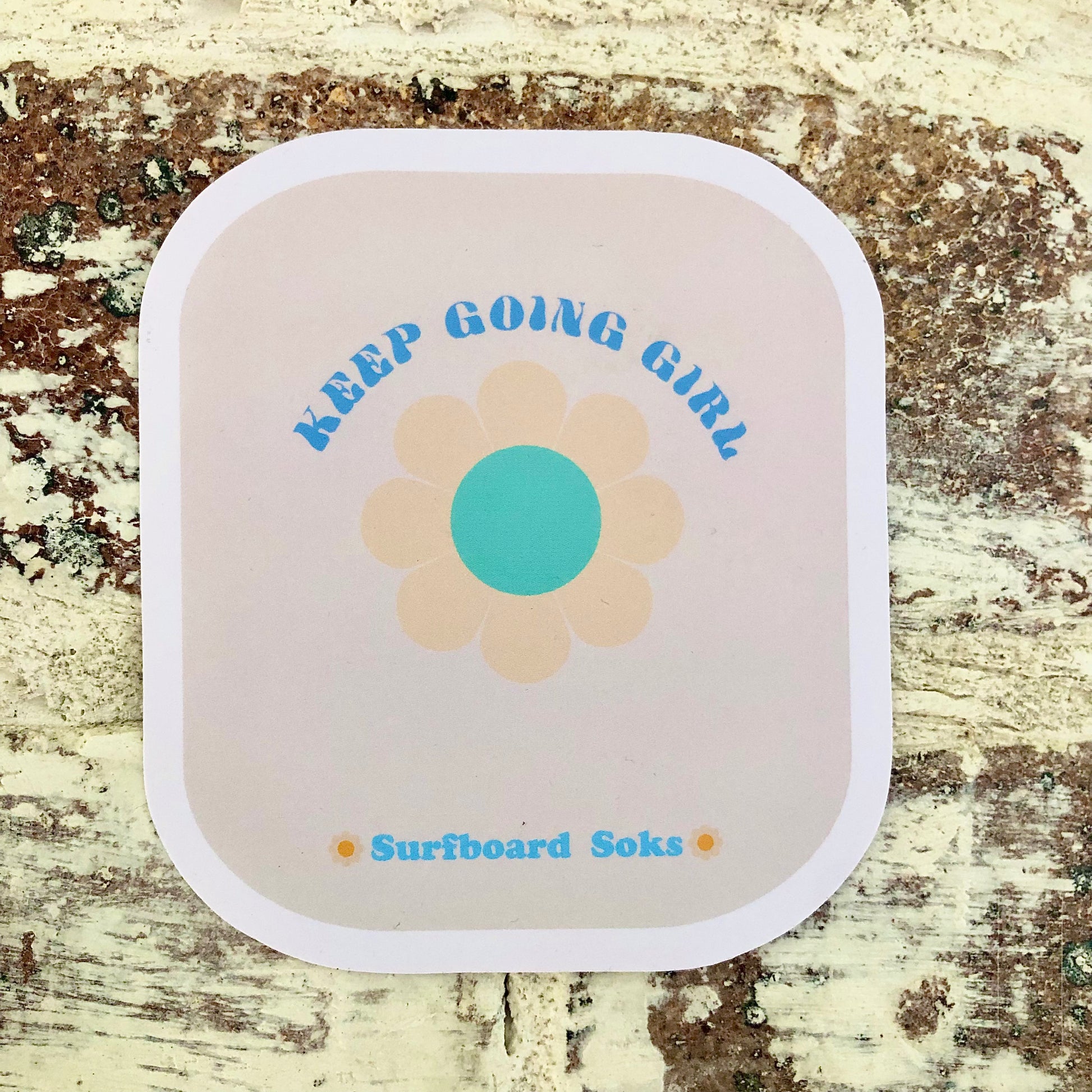 This beautiful eye-catching 'keep going girl' graphic sticker is custom designed by the team at Surfboard Soks and printed on high-quality vinyl. It is waterproof, has easy-peel die-cut edges and measures 11cm high x 9.8cm wide and can be stuck on any smooth surface such as your car bumpers, windows, laptop, notebook, school books, skateboard, water bottles, fridges, windows or even your surfboard!