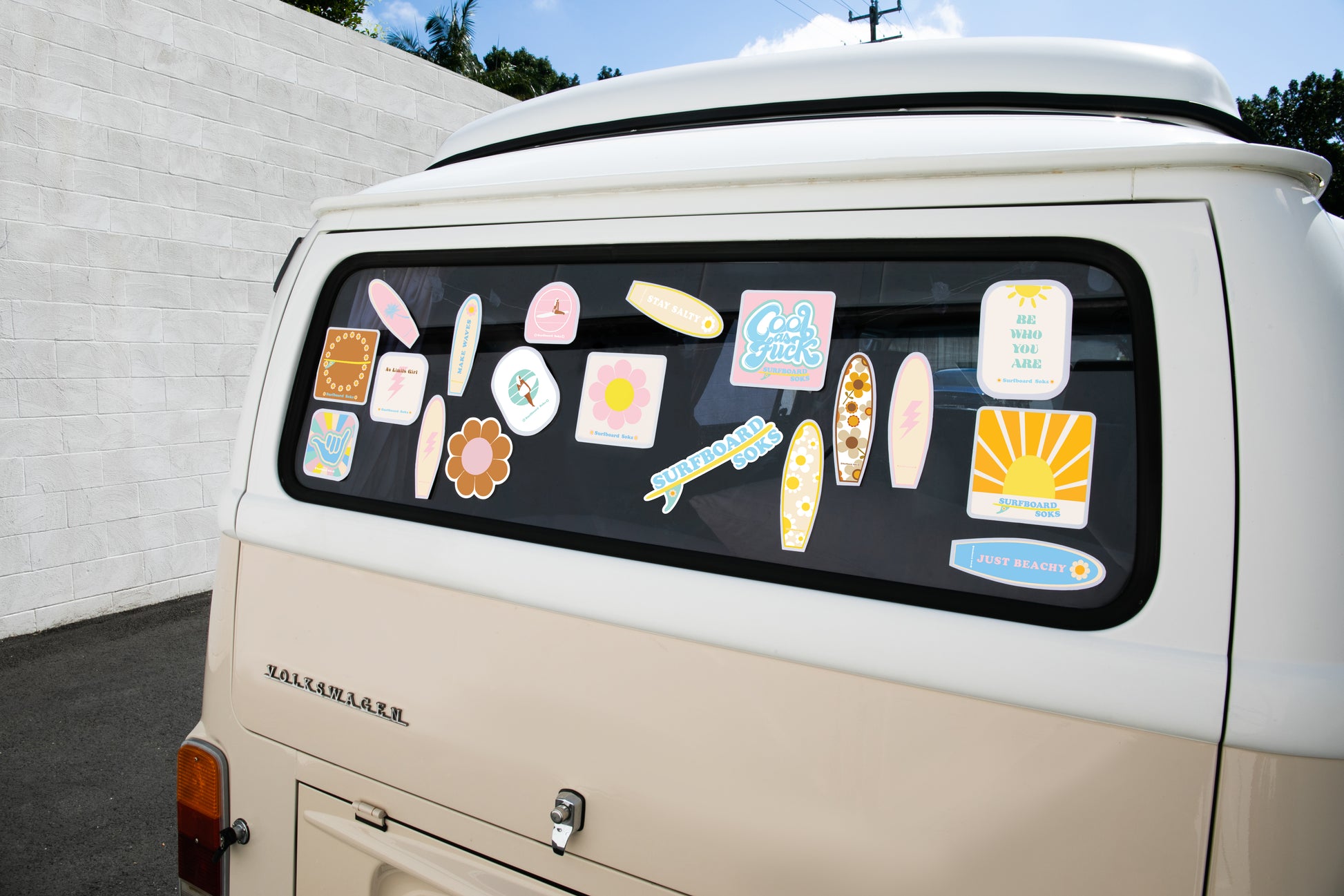 These beautiful eye-catching graphic text Just Beachy surfboard-shaped stickers are custom designed by the team at Surfboard Soks and printed on high-quality vinyl. They are waterproof, have easy peel die-cut edges, and are printed on a clear background. They measure 14cm high x 4.5cm wide and can be stuck on any smooth surface such as your car bumpers, windows, laptop, notebook, school books, skateboard, water bottles, fridges, windows or even your surfboard!!